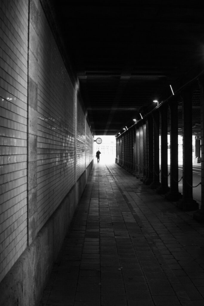Mit der Kamera in der Hand gehe ich oft völlig problemlos an dunkle, eher ungemütliche Orte, die ich sonst in der Regel meiden würde. Denn das ist genau die Kulisse, die ich für meine Fotos haben möchte. Das ist insbesondere der Grund, warum ich „mein“ Genre, die Street Fotografie, so liebe: Es gibt keine Ausreden, nicht fotografieren zu gehen. Was bei Landschaftsfotografie jeden Plan zunichte machen würde – zum Beispiel Regenwetter – erzeugt bei der Street Fotografie vielleicht genau die Stimmung, die das Foto am Ende perfekt macht.